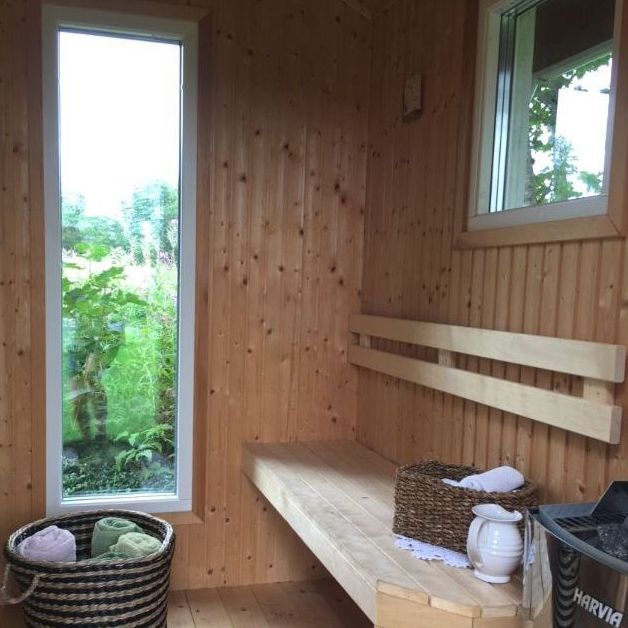 I vår bastu upplever du tystnad, doften av eteriska oljor, lavendel, apelsin eller någon annan favorit. När du sitter i bastun finns ett stort fönster där du kan kika ut på den vackra ängen.
